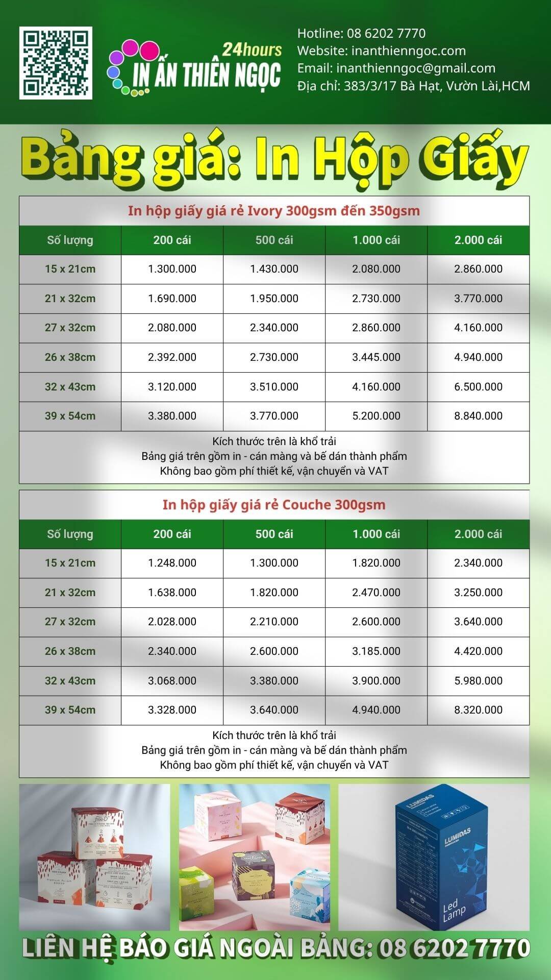 Giống như các ấn phẩm khác, in hộp giấy số lượng lớn luôn giúp giảm giá thành đơn vị (VND/Hộp) một cách đáng kể. Các đơn hàng in hộp giấy số lượng ít thường phải chịu chi phí cố định (thiết lập máy, làm khuôn) cao hơn.